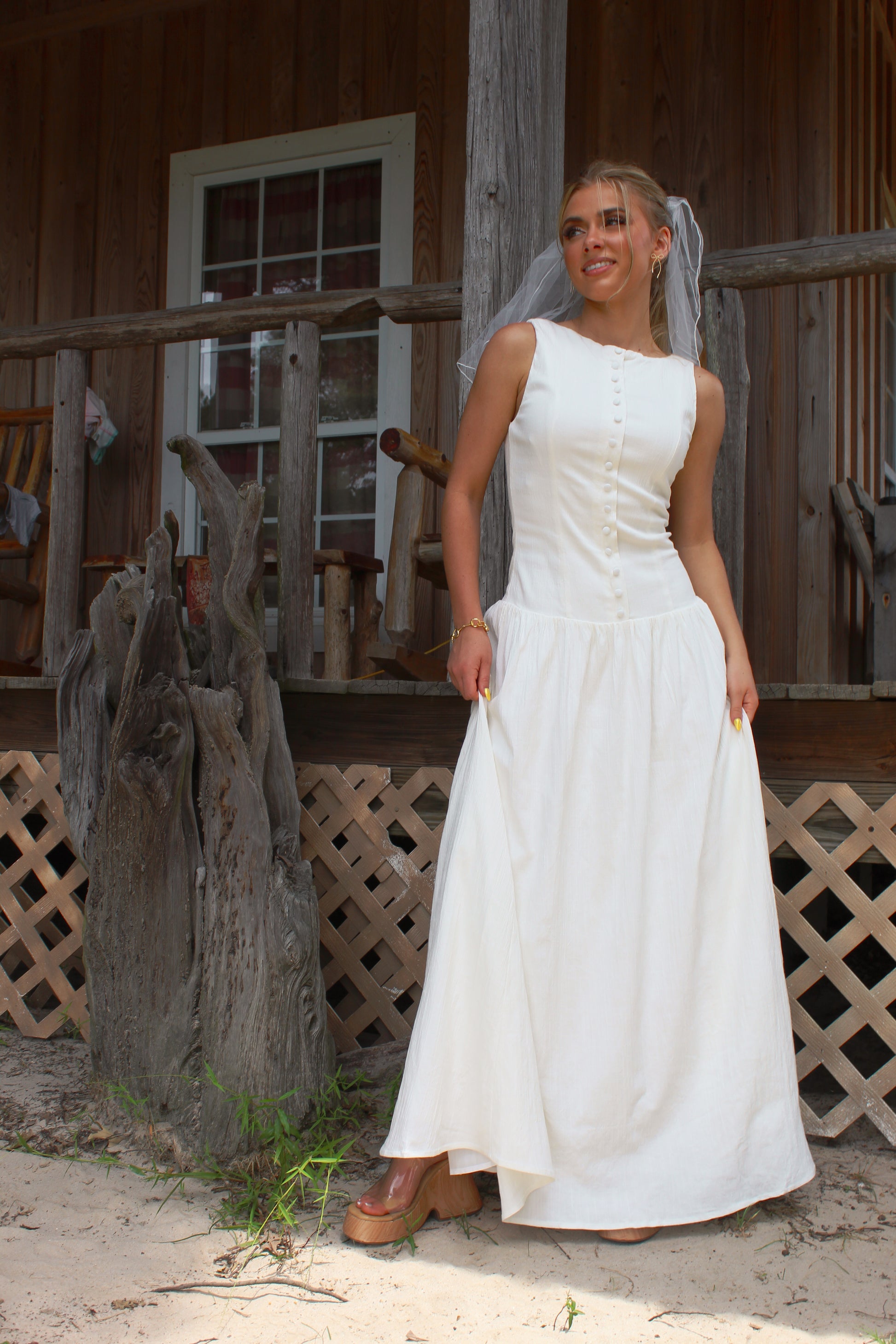 Stretch linen button detail drop waist maxi dress